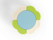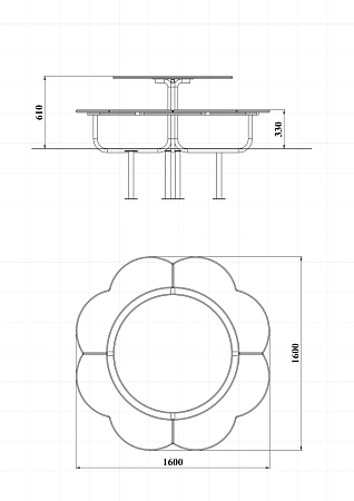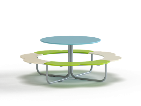 Столик в форме ромашки состоит из металокаркаса, фанерных сидений и столешницы.