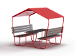 Столик с навесом состоит из сборного металокаркаса, сидений и спинок из древесно-полимерного композита (ДПК), столешницы и навеса из фанеры.