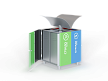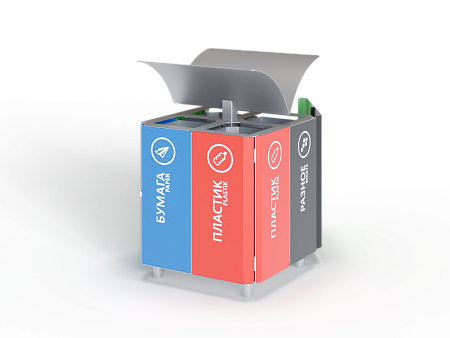 Металлическая четырехсекционная урна для раздельного сбора мусора.