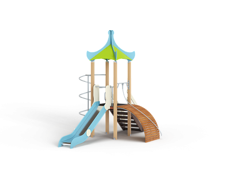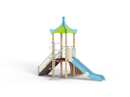 Детский игровой комплекс состоит из одной башни с крышей, лестницей, горкой, трапом-барабаном с перекладиной и канатом, ручками и шестом-спиралью.