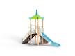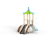 Детский игровой комплекс состоит из одной башни с крышей, лестницей, горкой, трапом-барабаном с перекладиной и канатом, ручками и шестом-спиралью.