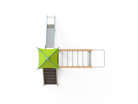 Детский игровой комплекс состоит из одной башни с продолжением в виде гимнастического комплекса. На башне установлена крыша, лестница, горка, альпинистская стенка с перекладиной и канатом. Гимнастический комплекс состоит из рукохода, шведской стенки, турника, гимнастических колец и полипропиленовой сетки.