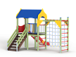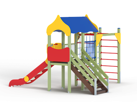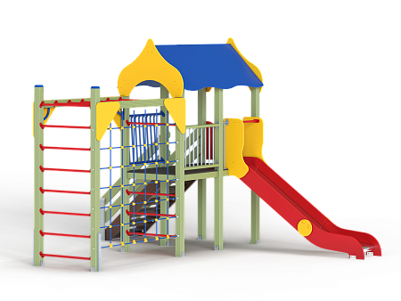 Детский игровой комплекс состоит из башни с крышей, шведской стенкой, ограждениями фанерным и металлическим , огражддением из бруса с перекладинами, горкой и лестницей. К башне присоединен гимнастический комплекс с рукоходом, полипропиленовой сеткой и шведской стенкой.
