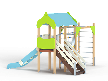 Детский игровой комплекс состоит из башни с крышей, шведской стенкой, ограждениями фанерным и металлическим , огражддением из бруса с перекладинами, горкой и лестницей. К башне присоединен гимнастический комплекс с рукоходом, полипропиленовой сеткой и шведской стенкой.