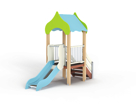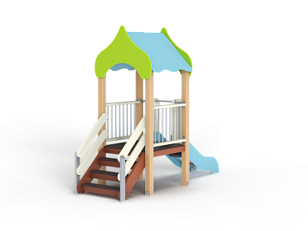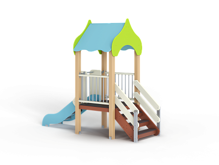 Детский игровой комплекс состоит из одной башни с крышей, лестницей, горкой, ограждениями из бруса с перекладинами.
