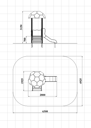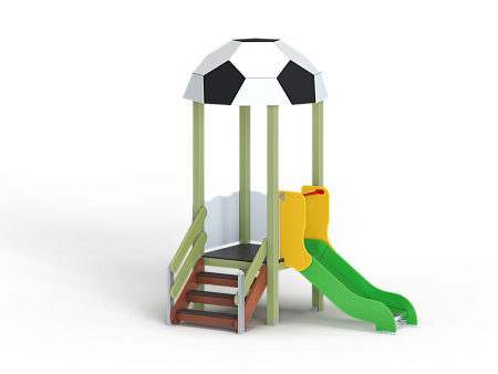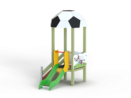Детский игровой комплекс стилизован в футбольной тематике, состоит из одной башни с крышей в виде половины футбольного мяча, лестницы, горки, фанерных ограждений с художественно оформленной поверхностью.