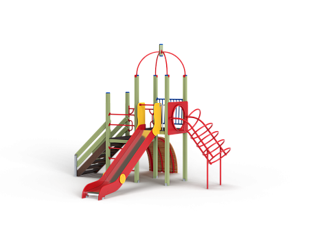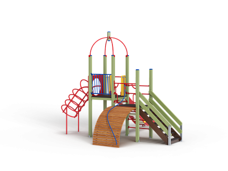 Детский игровой комплекс состоит из двух разновысоких башен. На одной из башен установлена металлическая крыша, спираль наклонная, горка, металлическое ограждение, на другой башне установлен трап барабан с перекладиной и канатом, шведская стенка, ручки и лестница.