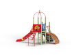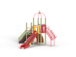 Детский игровой комплекс состоит из двух разновысоких башен. На одной из башен установлена металлическая крыша, спираль наклонная, горка, металлическое ограждение, на другой башне установлен трап барабан с перекладиной и канатом, шведская стенка, ручки и лестница.