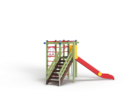 Детский игровой комплекс состоит из треугольной башни и гимнастического комплекса. На башне установлена лестница, горка, металлическое ограждение и шведская стенка. На гимнастическом ком-плексе установлены перекладины, перекладины усиленные, перекладина с канатом, перекладина с кольцами, шведская стенка и сетка полипропиленовая.