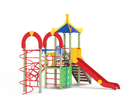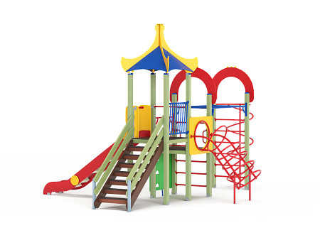 Детский игровой комплекс состоит из двух разновысоких башен. На одной из башен установлены крыша, лестница, горка, металлическое ограждение, на другой башне установлены альпинистская стенка, перекладина с канатом, ручки, спираль наклонная, ограждение с лазом. Одна из башен имеет продолжение в виде гимнастического комплекса который состоит из рукохода, шведской стенки, шеста-спирали и двух фанерных арок.