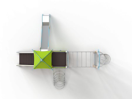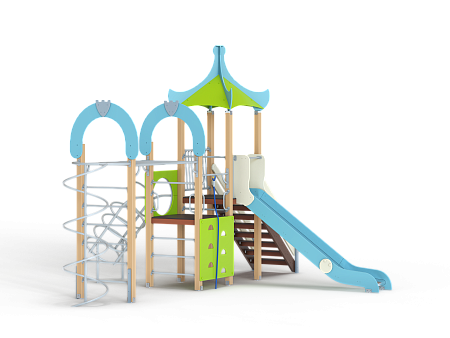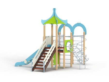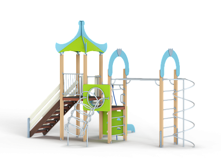 Детский игровой комплекс состоит из двух разновысоких башен. На одной из башен установлены крыша, лестница, горка, металлическое ограждение, на другой башне установлены альпинистская стенка, перекладина с канатом, ручки, спираль наклонная, ограждение с лазом. Одна из башен имеет продолжение в виде гимнастического комплекса который состоит из рукохода, шведской стенки, шеста-спирали и двух фанерных арок.