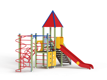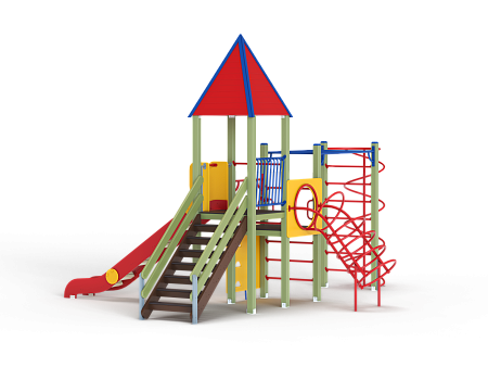 Детский игровой комплекс состоит из двух разновысоких башен. На одной из башен установлены крыша в форме пирамиды, лестница, горка, металлическое ограждение, на другой башне установлены альпинистская стенка, перекладина с канатом, спираль наклонная, ограждение с лазом. Одна из башен имеет продолжение в виде гимнастического комплекса,который состоит из рукохода, шведской стенки и шеста-спирали.