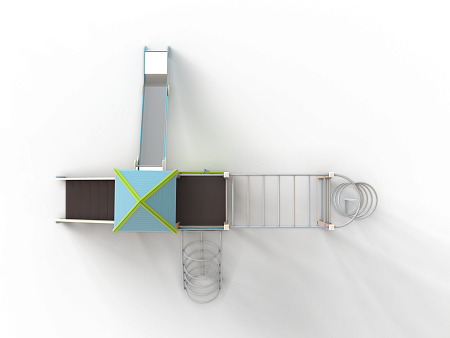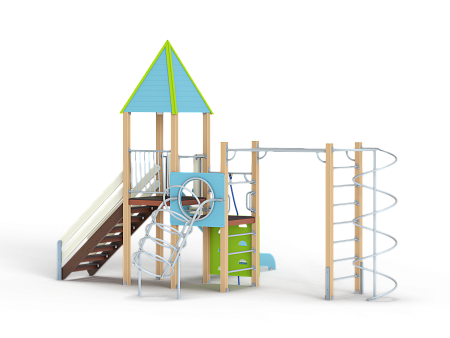 Детский игровой комплекс состоит из двух разновысоких башен. На одной из башен установлены крыша в форме пирамиды, лестница, горка, металлическое ограждение, на другой башне установлены альпинистская стенка, перекладина с канатом, спираль наклонная, ограждение с лазом. Одна из башен имеет продолжение в виде гимнастического комплекса,который состоит из рукохода, шведской стенки и шеста-спирали.