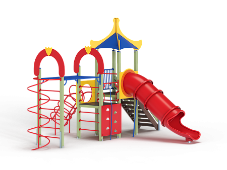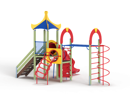 Детский игровой комплекс состоит из двух разновысоких башен. На одной из башен установлены крыша, лестница, горка-труба пластиковая, металлическое ограждение, на другой башне установлены альпинистская стенка, перекладина с канатом, ручки, спираль наклонная, ограждение с лазом. Одна из башен имеет продолжение в виде гимнастического комплекса который состоит из рукохода, шведской стенки, шеста-спирали и фанерных арок.