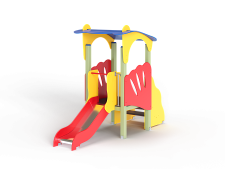 Детский игровой комплекс состоит из одной башни с горкой, фасонными фанерными крышей, лестницей и ограждениями.