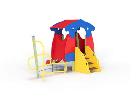 Детский игровой комплекс состоит из башни с продолжением в виде спортивного элемента, который состоит из металлического элемента с сеткой полипропиленовой, металлической ручки и изогнутой металлической стойки, крепящихся к столбу. На башне установлена крыша, лестница, горка, фанерные ограждения.