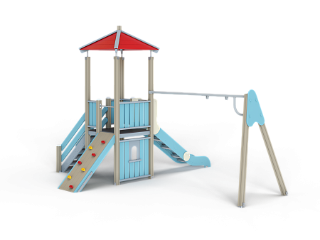 Детский игровой комплекс состоит из башни с качелями. На башне установлены крыша четырехскатная, пять ограждений из бруса, трап из бруса с альпинистскими камнями, лестница, горка и примыкающие к ней качели на деревянных столбах.