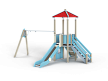 Детский игровой комплекс состоит из башни с качелями. На башне установлены крыша четырехскатная, пять ограждений из бруса, трап из бруса с альпинистскими камнями, лестница, горка и примыкающие к ней качели на деревянных столбах.