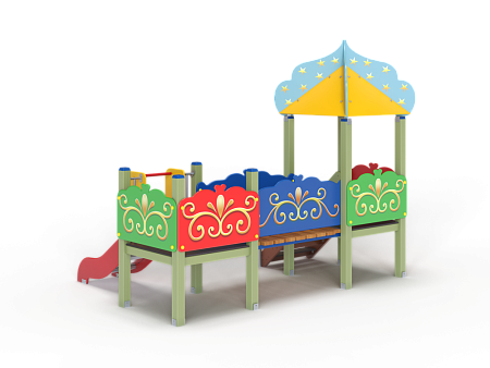 Детский игровой комплекс с художественным оформлением в восточном стиле, состоит из двух башен соединенных прямым мостом с фанерными ограждениями. На первой башне установлена крыша, два фанерных ограждения и лестница. На второй башне установлены ограждения фанерные и горка.