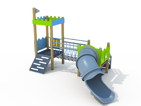 Детский игровой комплекс состоит из двух башен соединенных радиусным мостом с металлическими перилами. На первой башне установлена крыша,фанерное ограждение, ограждение из бруса с перекладинами и лестница. На второй башне установлена горка, фанерное ограждение и ограждение из бруса с перекладинами.