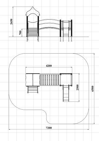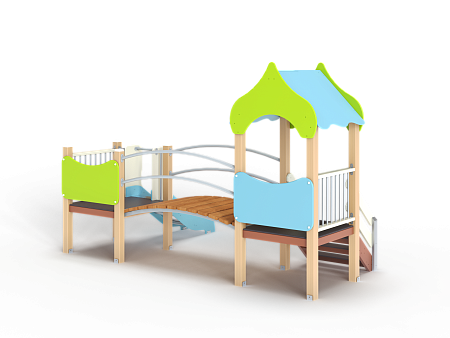 Детский игровой комплекс состоит из двух башен соединенных радиусным мостом с металлическими перилами. На первой башне установлена крыша,фанерное ограждение, ограждение из бруса с перекладинами и лестница. На второй башне установлена горка, фанерное ограждение и ограждение из бруса с перекладинами.