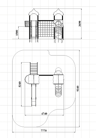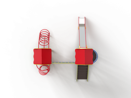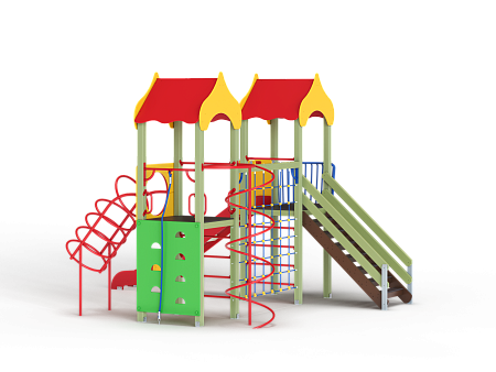 Детский игровой комплекс состоит из двух башен с крышами. На одной из башен установлена лестница, горка, балкон, шведская стенка. На другой башне установлены альпинистская стенка, перекладина с канатом, шест спираль, шведская стенка, ограждение с полукруглым вырезом, спираль наклонная и ручки вспомогательные. Башни соединены полипропиленовой сеткой и столбом