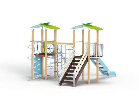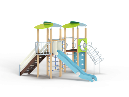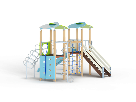 Детский игровой комплекс состоит из двух башен с крышами. На одной из башен установлены лестница, горка, балкон и шведская стенка. На другой башне установлены альпинистская стенка, перекладина с канатом, шест-спираль, шведская стенка, ручки, ограждение с круглым вырезом и спираль наклонная. Башни соединены полипропиленовой сеткой и столбом.