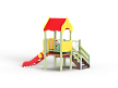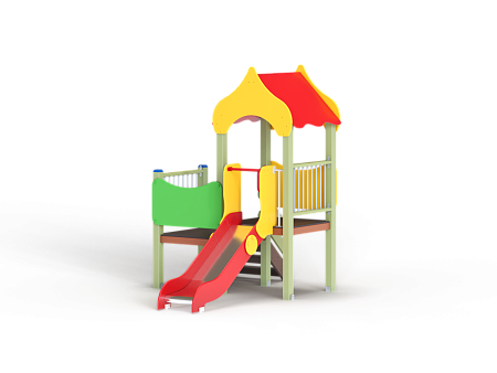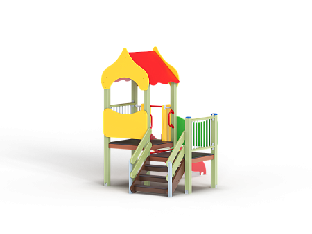 Детский игровой комплекс состоит из двух разновысоких башен. На одной башне установлены фанерная крыша, горка, вспомогательные ручки, фанерное ограждение и ограждение из бруса с перекладинами. На второй башне установлена лестница, фанерное ограждение и ограждение из бруса с перекладинами.