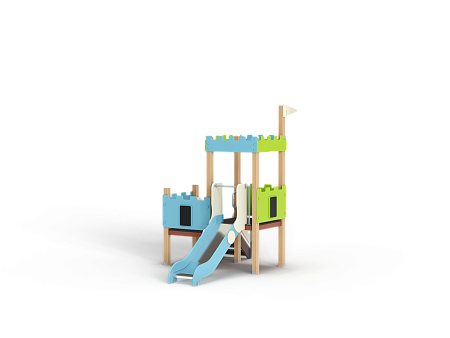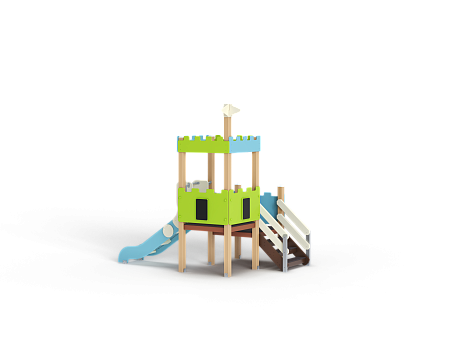 Детский игровой комплекс состоит из двух разновысоких башен. На одной из башен установлена фанерная крыша, декоративные фанерные флажки, горка, вспомогательные ручки, фанерные ограждения, на другой башне установлена лестница и фанерные ограждения.