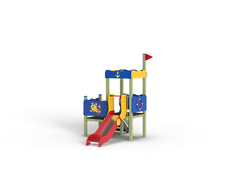 Детский игровой комплекс состоит из двух разновысоких башен. На одной из башен установлена фанерная крыша, декоративные фанерные флажки, горка, вспомогательные ручки, фанерные ограждения с художественно оформленной поверхностью в морской тематике, на другой башне установлена лестница и фанерные ограждения с художественно оформленной поверхностью в морской тематике.