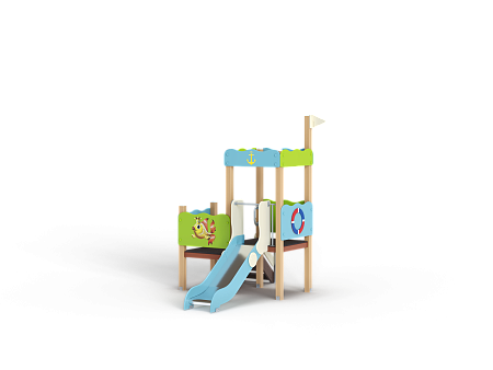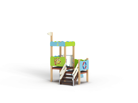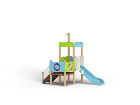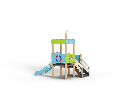 Детский игровой комплекс состоит из двух разновысоких башен. На одной из башен установлена фанерная крыша, декоративные фанерные флажки, горка, вспомогательные ручки, фанерные ограждения с художественно оформленной поверхностью в морской тематике, на другой башне установлена лестница и фанерные ограждения с художественно оформленной поверхностью в морской тематике.