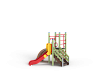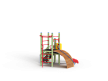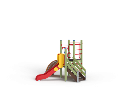 Детский игровой комплекс состоит из двух разновысоких башен. На одной из башен установлена лестница, горка, металлическое ограждение, на другой башне установлены трап-барабан с перекладиной и канатом, шест, две шведские стенки и ручки вспомогательные.