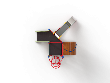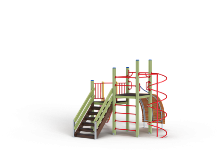 Детский игровой комплекс состоит из двух разновысоких башен. На одной из башен установлена лестница, горка, металлическое ограждение, на другой башне установлены трап барабан с перекладиной и канатом, шест спираль, две шведские стенки и ручки вспомогательные.