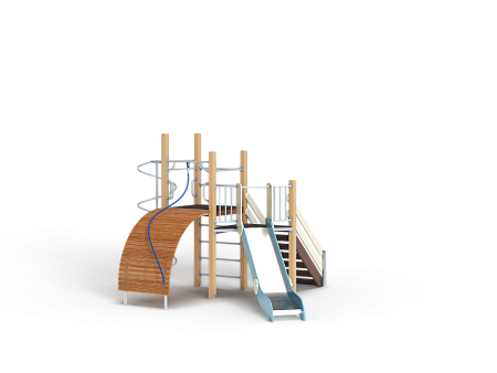 Детский игровой комплекс состоит из двух разновысоких башен. На одной из башен установлена лестница, горка, металлическое ограждение, на другой башне установлены трап барабан с перекладиной и канатом, шест спираль, две шведские стенки и ручки вспомогательные.