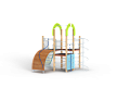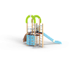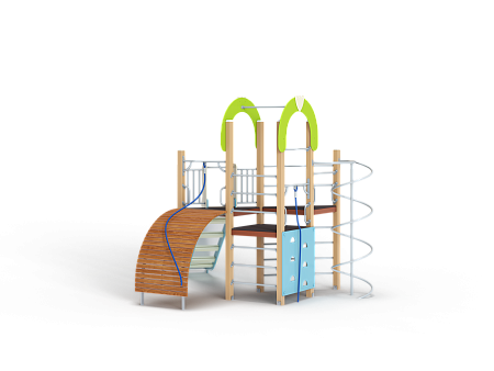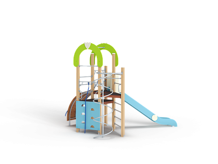 Детский игровой комплекс состоит из трёх башен. На одной из башен установлены трап-барабан с перекладиной и канатом, горка, металлическое ограждение, ручки вспомогательные, на второй башне установлены, шест спираль, шведская стенка и ручки вспомогательные, на третьей башне установлены альпинистская стенка, перекладина с канатом, ручки вспомогательные, шведская стенка, декоративные фанерные арки.