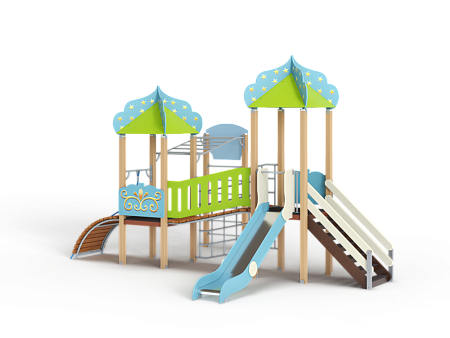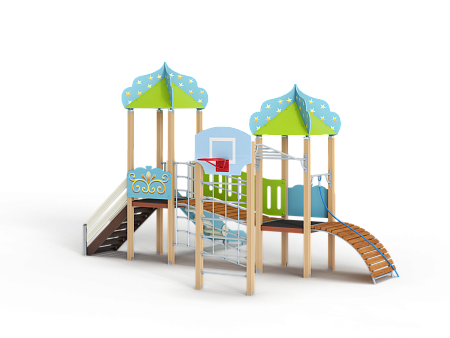 Детский игровой комплекс состоит из двух башен с крышами. На первой башне установлена лестни-ца, горка и фанерное ограждение. На второй башне установлены трап барабан с перекладиной и канатом и фанерное ограждение. Башни соеди-нены между собой разновысоким мостом, с одной стороны которого установлено фанерное огражде-ние, а с другой стороны сетка металлическая. Вто-рая башня имеет продолжение в виде вынесенной шведской стенки с баскетбольным щитом, соеди-няются металлическим рукоходом