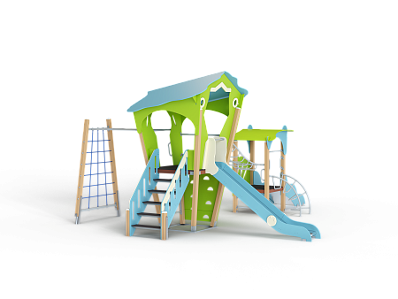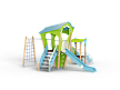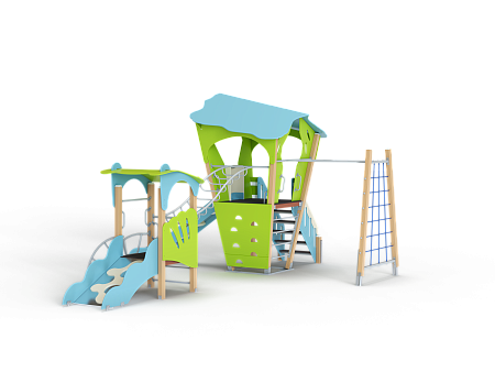 Детский игровой комплекс состоит из двух башен. На одной из башен установлена лестница, горка, альпинистская стенка, ограждение, ручки вспомогательные и внешняя сетка полипропиленовая, соединенная с башней рукоходом. На другой башне установлены трап, лиана, шведская стенка, ручки вспомогательные и ограждение. Башни соединены между собой металлическим рукоходом.