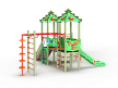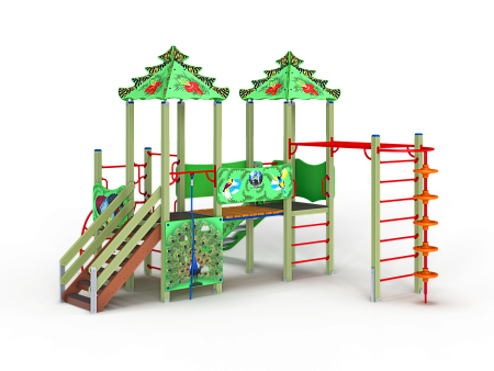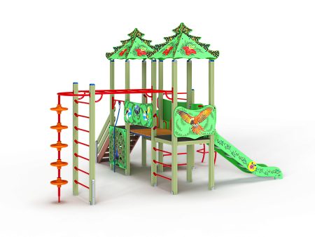 Детский игровой комплекс художественным оформлением в стиле “Райских птиц”. Комплекс состоит из двух башен с вынесенной шведской стенкой. На первой башне установлена крыша, альпинистская стенка с перекладиной и канатом, лестница, и примыкающая к нему полубашня с шведской стенкой, лианой, ручками вспомогательными и ограждением фанерным. На второй башне установлена горка, крыша, ручки вспомогательные, шведская стенка и примыкающий к ней рукоход с вынесенной шведской стенкой и шестом с пластиковыми кольцами. Башни соединены прямым мостом с фанерными перилами.