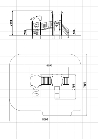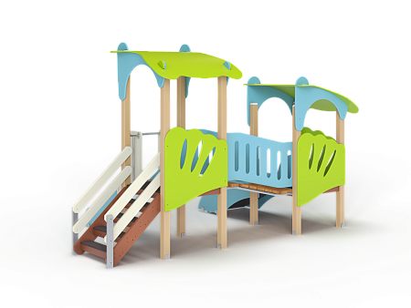 Детский игровой комплекс состоит из двух башен с фасонными крышами, соединенных разновысоким мостом с фанерными перилами. На первой башне установлены лестница, горка и ограждение. На второй башне установлены трап и ограждения.
