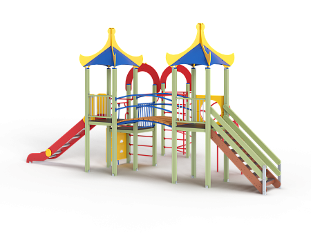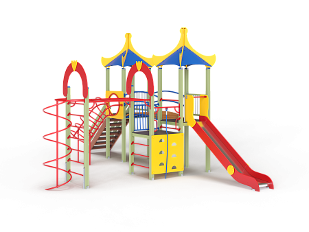 Детский игровой комплекс состоит из двух башен и одной полубашни с вынесенной шведской стенкой. На первой башне с полубашней установлена альпинистская стенка с перекладиной и канатом, ограждение металлическое, четыре вспомогательные ручки, шведская стенка и примыкающий к ней рукоход с вынесенной шведской стенкой, две декоративные арки, со стороны вынесенной шведской стенки установлен шест спираль. На второй башне установлена горка, крыша и ограждение из бруса с перекладинами. На третьей башне установлена крыша, лестница, ограждение из бруса с перекладинами, спираль наклонная. Вторая и третья башня соединены радиусным мостом с металлическими перилами.