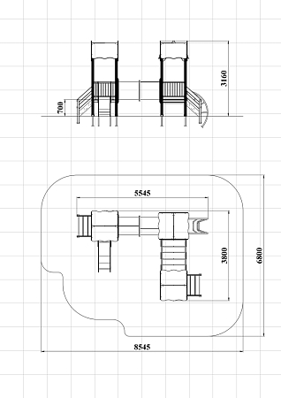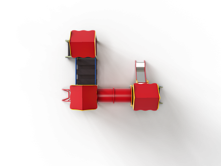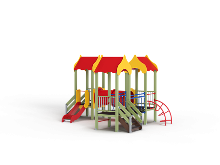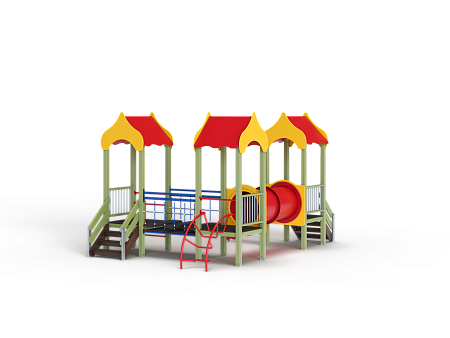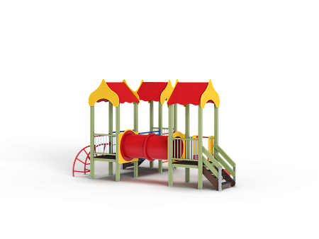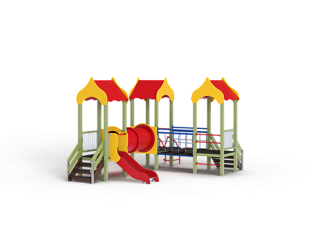Детский игровой комплекс состоит из трёх башен. На первой башне установлена лестница и ограждение из бруса с перекладинами. На второй башне установлена горка и ограждение из бруса с перекладинами. На третьей башне установлена горка, лестница и ограждение из бруса с перекладинами. Третья и вторая башни соединены пластиковой трубой переходом, вторая и первая соединены подвесным мостом.