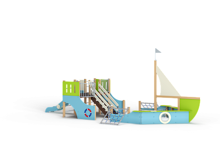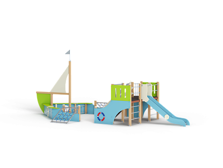 Детский игровой комплекс скомпонован в форме корабля. На кормовой части установлена площадка с горкой, лестница, балкон, шведские стенки, ограждения металлические и фанерные. По периметру расположены фанерные ограждения с декоративными накладками, две сетки полипропиленовые, две металлические стяжки, мачта с фанерным парусом и металлическим флагом.