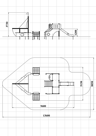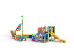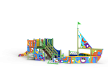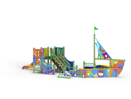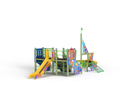 Детский игровой комплекс скомпонован в форме корабля с художественным оформлением в стиле графити. На кормовой части установлена площадка с горкой, лестница, балкон, шведские стенки, ограждения металлические и фанерные. По периметру расположены фанерные ограждения с декоративными накладками, две сетки полипропиленовые, две металлические стяжки, мачта с фанерным парусом и металлическим флагом.