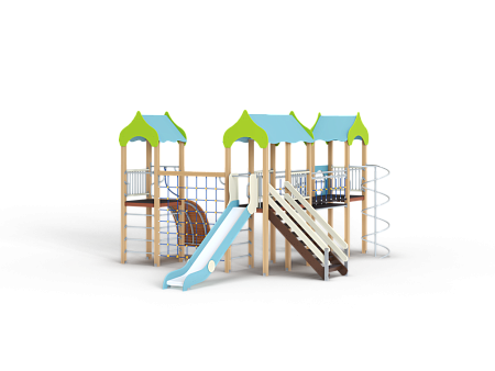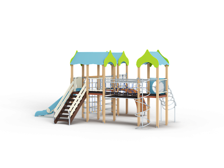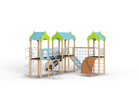 Детский игровой комплекс состоит из трех башен. На первой башне установлены альпинистская стенка с перекладиной и канатом, шест прямой, ограждение из бруса с перекладинами и шведская стенка. На второй башне установлена лестница, горка и два ограждения из бруса с перекладинами . Первая и вторая башня соединяются полипропиленовой сеткой. На третьей башне установлено ограждение из бруса с перекладинами, шест спираль и спираль наклонная. Вторая и третья башни соединены подвесным мостом.