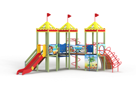 Детский игровой комплекс состоит из трёх башен с крышами. Комплекс имеет художественное оформление в стиле пиратов. На первой башне установлена альпинистская стенка с перекладиной и канатом, спираль наклонная, ограждение с вырезом, трап барабан с перекладиной и канатом, ручки вспомогательные. На второй башне установлены шест спираль, перекладина, ограждение фанерное, ручки вспомогательные. На третьей башне установлена лестница, горка и ограждение. Первая и вторая башни соединены прямым мостом с фанерными перилами, вторая и третья соединены подвесным мостом..