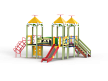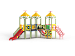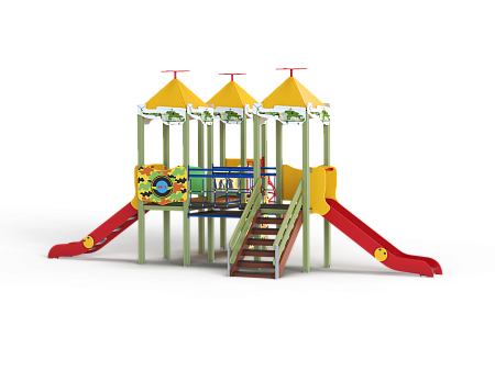 Детский игровой комплекс с художественным оформлением в стиле военного городка, который состоит из трёх башен с крышами. На первой башне установлена альпинистская стенка с перекладиной и канатом, спираль наклонная, ограждение с вырезом, трап барабан с перекладиной и канатом, ручки вспомогательные. На второй башне установлены горка, фанерное ограждение. На третьей башне установлена лестница, горка и фанерное ограждение. Первая и вторая башни соединены прямым мостом с фанерными перилами, вторая и третья соединены подвесным мостом.