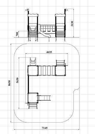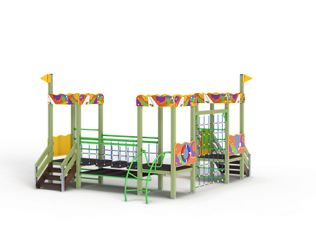 Детский игровой комплекс состоит из трёх башен с художественным оформлением в стиле граффити. На первой башне установлена лестница, декоративные фанерные флажки, шведская стенка и фанерное ограждение. На второй башне установлена лиана и фанерное ограждение. На третьей башне установлена горка, лестница, декоративные фанерные флажки, шведская стенка и фанерное ограждение. Третья и вторая башни соединены сеткой полипропиленовой, вторая и первая соединены подвесным мостом.