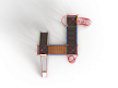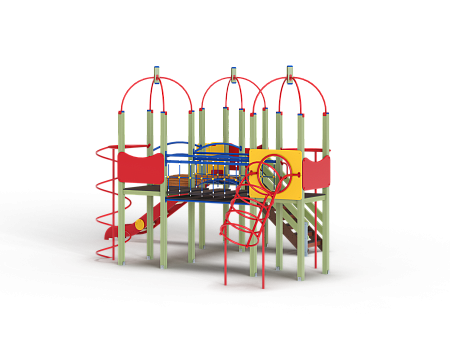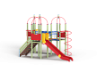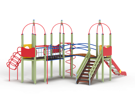 Детский игровой комплекс состоит из трёх башен с металлическими крышами. На первой башне установлена лестница, горка, фанерное ограждение и она соединяется со второй радиусным мостом с металлическими перилами. На второй башне установлено фанерное ограждение, шест спираль и она соединяется подвесным качающимся мостом с третьей башней. На третьей башне установлена спираль наклонная, шест и фанерное ограждение.