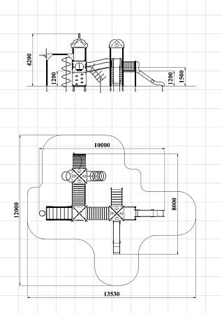 Детский игровой комплекс состоит из трёх башен с металлическими крышами, имеет художественное оформление в стиле граффити. На первой башне с полубашней установлены лестница, две горки, ограждения металлические и соединяется со второй башней разновысоким мостом с металлическими перилами. На второй башне установлены ограждение с круглым вырезом, альпинистская стенка, ручки вспомогательные, шведская стенка, внешний гимнастический комплекс с баскетбольным щитом и кольцом. Вторая башня соединяется с третьей радиусным мостом с фанерными перилами. На третьей башне установлена спираль наклонная, шест-спираль, ручки вспомогательные и трап барабан с перекладиной и канатом.