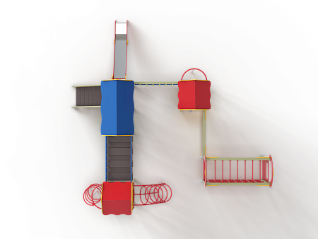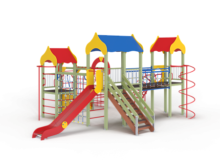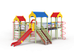 Детский игровой комплекс состоит из трёх башен с крышами. На первой башне установлена альпинистская стенка с перекладиной и канатом, швед-ская стенка, шест, ограждение и ручки вспомога-тельные. На второй башне установлены горка, ограждения, лестница, шведская стенка. На треть-ей башне установлены спираль наклонная, ограж-дение, шест спираль, ручки вспомогательные и пе-рекладина. Первая и вторая башни соединены сет-кой полипропиленовой, вторая и третья соедине-ны подвесным мостом. К первой башне присоеди-нен с помощью бум бревна гимнастический ком-плекс с рукоходом, сеткой металлической, двумя шведскими стенками и декоративными арками